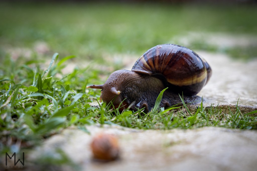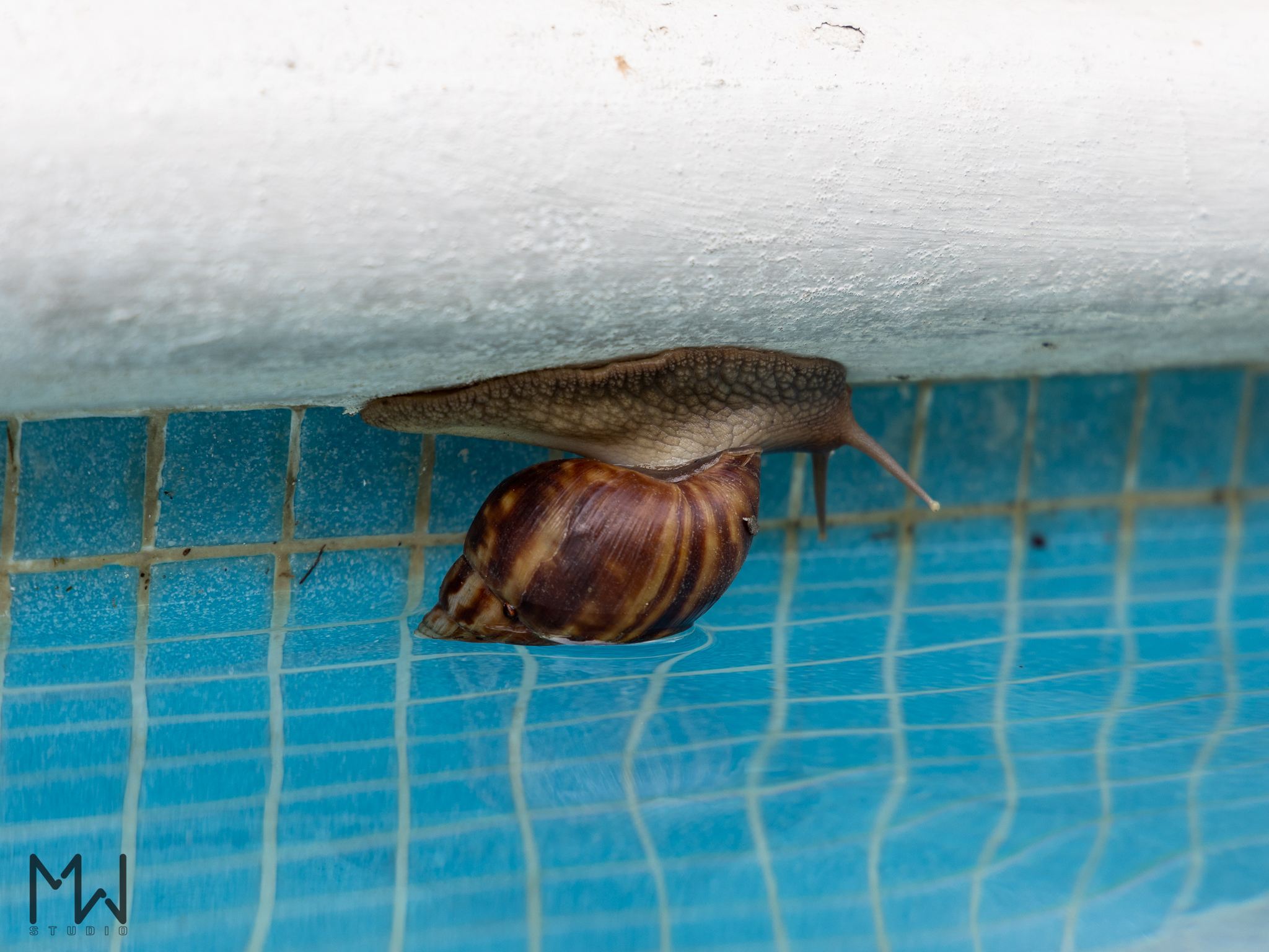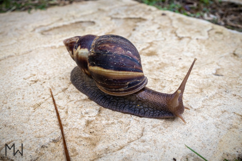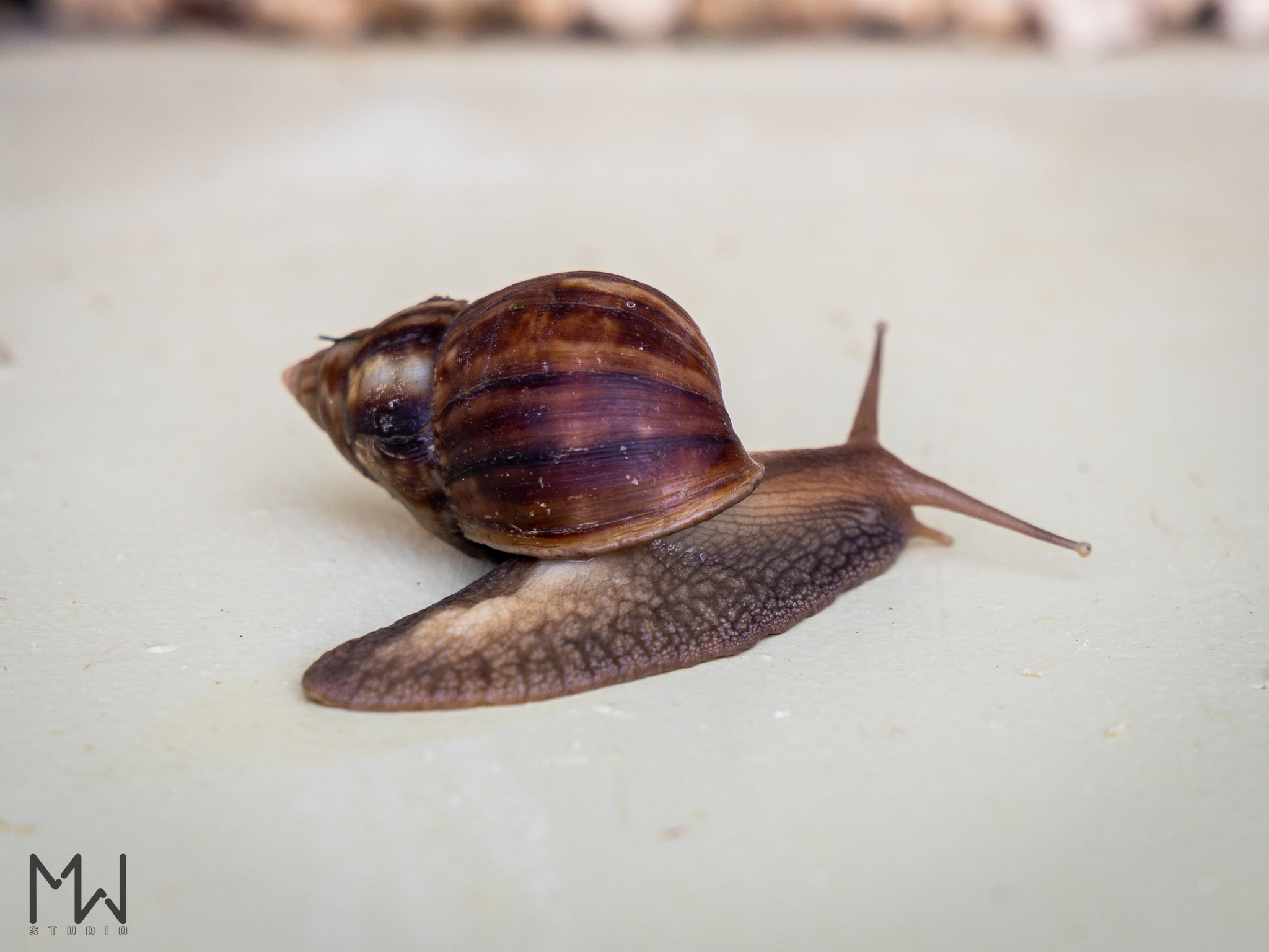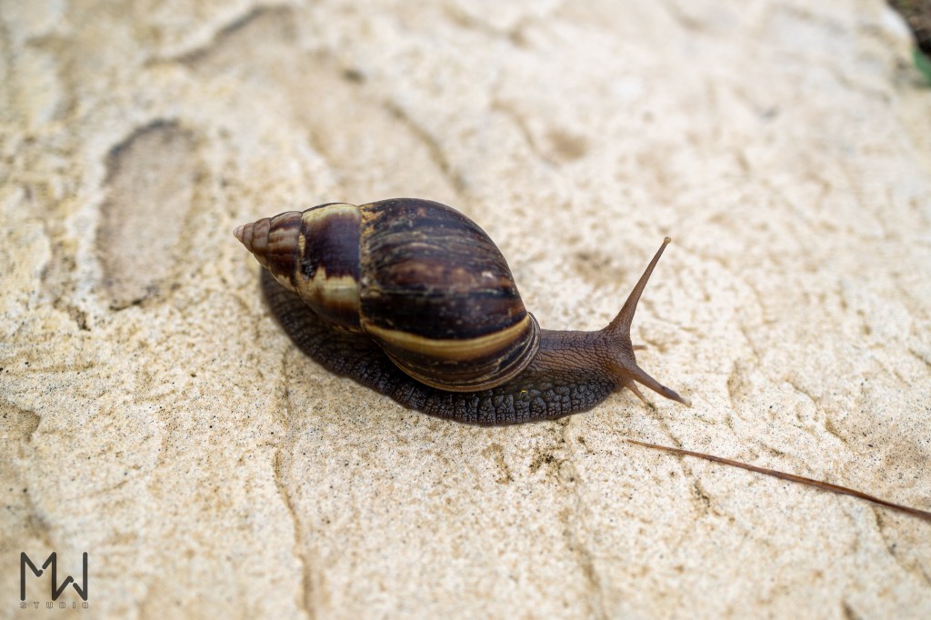 Though I’ve lived here for months, this was the first time I had seen any of these snails. The first one I saw was a white one on the handle of the bridge above the pool. Later as I was working in the bedroom, Garrett rushed in and pointed out the window at what I had thought was just a fallen leaf but ended up being a massive snail! 🐌 I ran out to take some photos with my phone when I realized I had a whole camera to take some higher-quality photos! I ran back inside, grabbed my camera, and decided to use the 35mm so I could get REALLY close (macro distance).