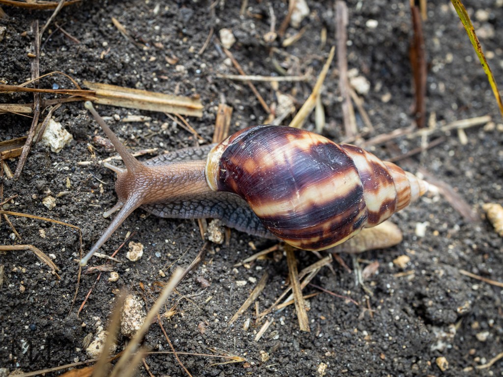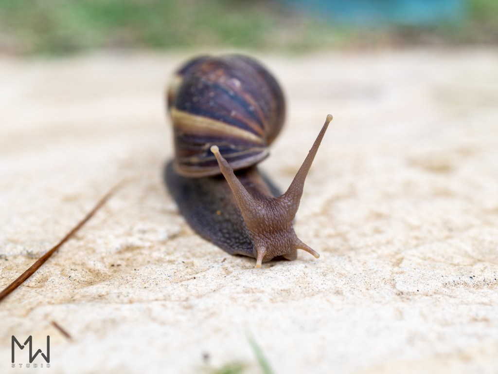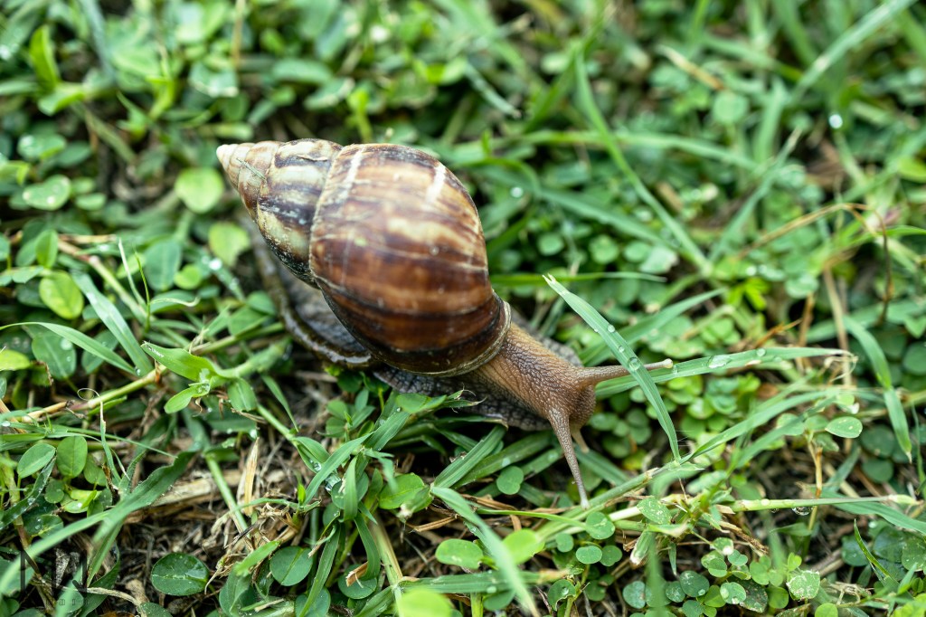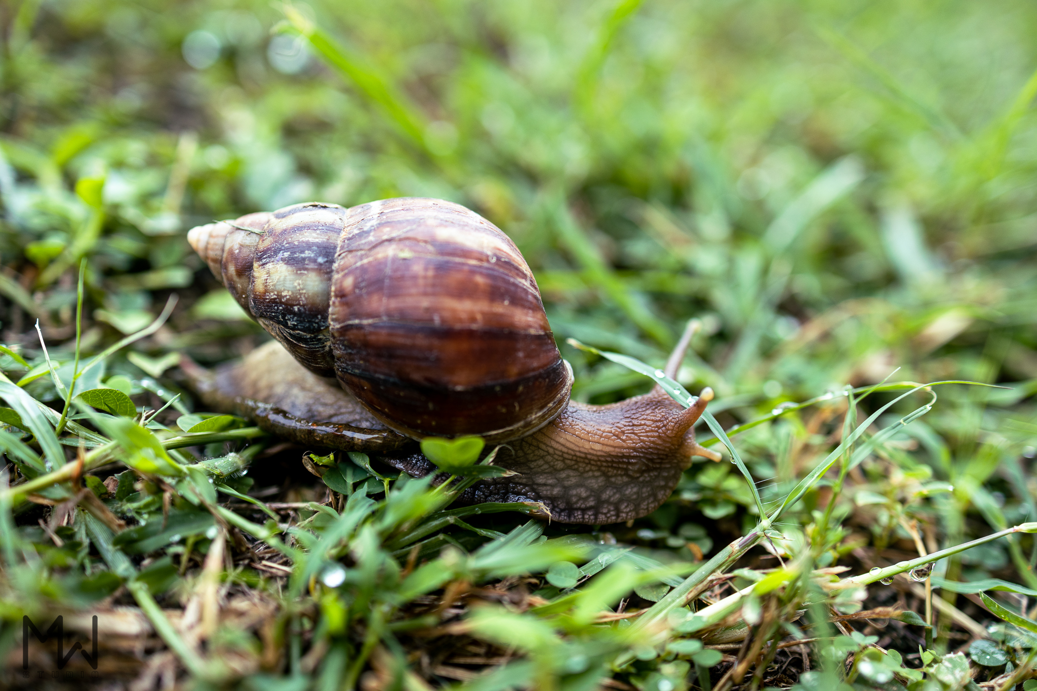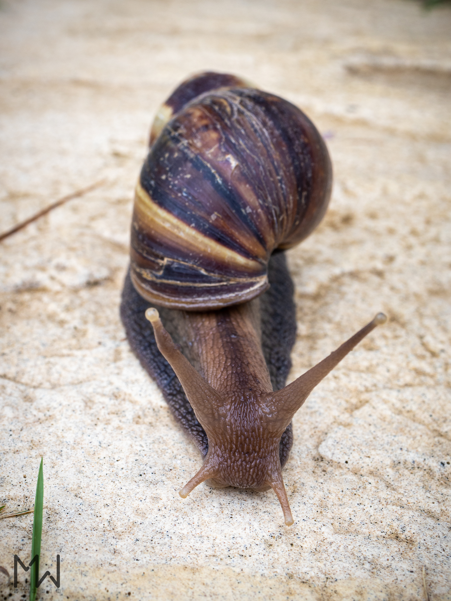 Though I’ve lived here for months, this was the first time I had seen any of these snails. The first one I saw was a white one on the handle of the bridge above the pool. Later as I was working in the bedroom, Garrett rushed in and pointed out the window at what I had thought was just a fallen leaf but ended up being a massive snail! 🐌 I ran out to take some photos with my phone when I realized I had a whole camera to take some higher-quality photos! I ran back inside, grabbed my camera, and decided to use the 35mm so I could get REALLY close (macro distance).